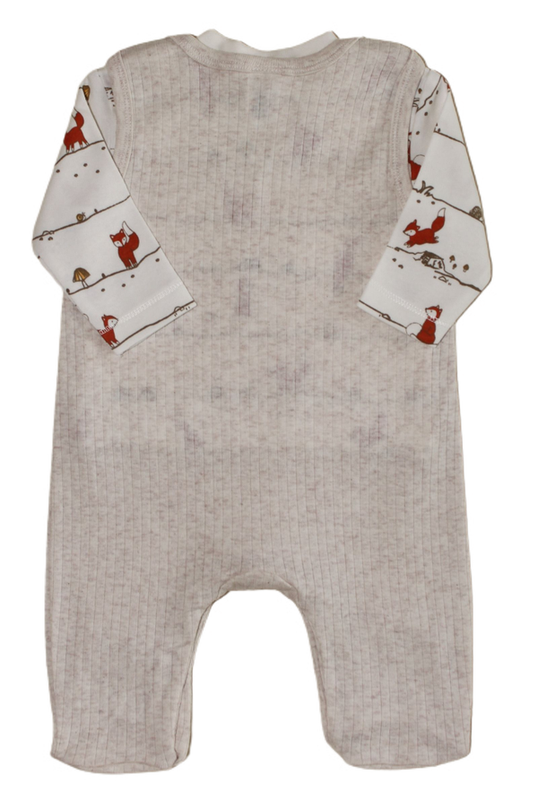 Een prachtig newbornpakje met op het shirtje met overslag kleine vosjes en beertjes afgebeeld. En de overall is beige gemeleerd en heeft een leuke vos op de voorkant staan.