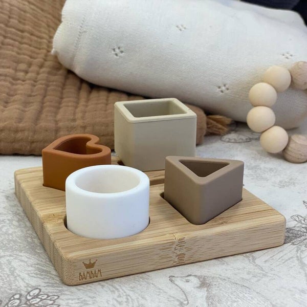 De vormpjes zijn gemaakt van BPA vrije siliconen. Dus stopt je kleintje er één in de mond is dat geen probleem. Ze zijn stevig genoeg om op te sabbelen of te bijten. Wel zo prettig bij doorkomende tandjes. Het plankje is gemaakt van duurzame bamboe.