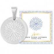 Januari heeft de anjer, juni de roos, september de aster – en zo heeft elke maand haar eigen bloem, subtiel gegraveerd in een elegant zilverkleurig rondje van stainless steel.