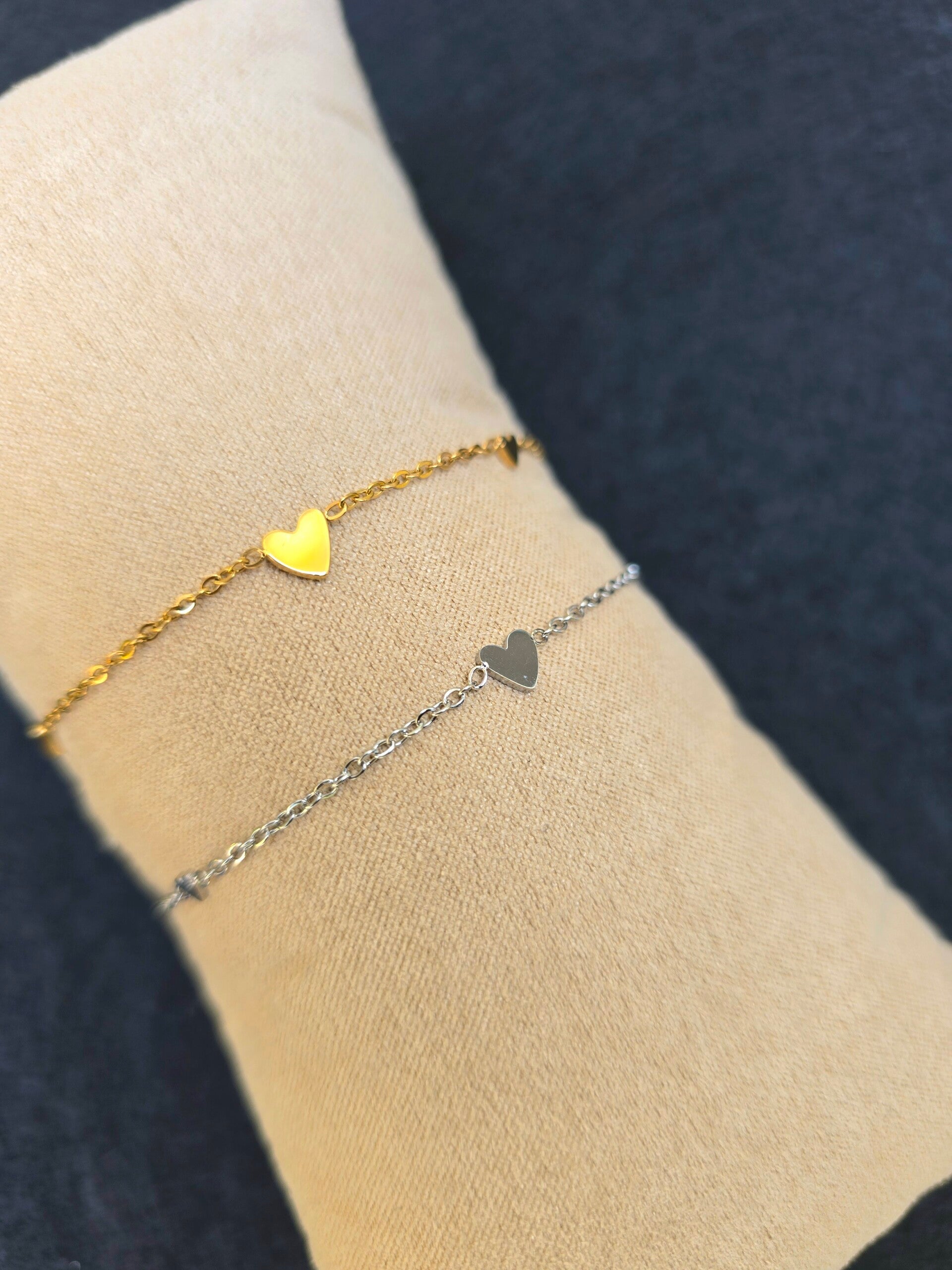 Deze verfijnde schakelarmband met drie hartjes – één in het midden en twee kleinere aan weerszijden – is een subtiel en liefdevol sieraad dat perfect past bij elke gelegenheid. Gemaakt van stainless steel en verkrijgbaar in zowel goud als zilver, is deze armband een prachtig symbool van liefde, verbondenheid en warmte.