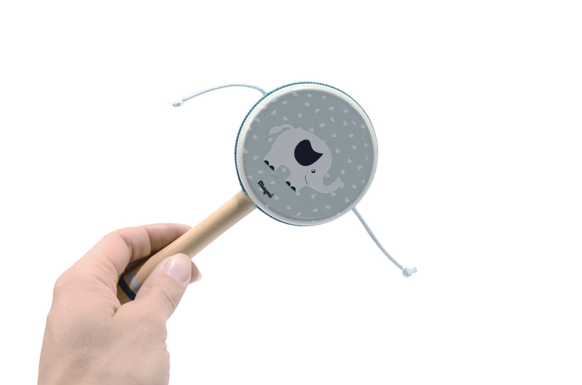 Aan beide kanten van de speelgoedtrommel zit een touwtje met een knoopje.