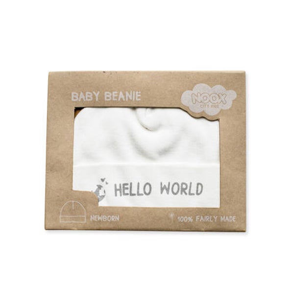 Zacht newborn babymutsje met de tekst Hello world.