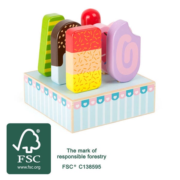 Deze kleurrijke ijsjes op een stokje, in 6 verschillende smaken, zijn gemaakt van 100% gecertificeerd FSC® hout en staan in een mooie houten display.